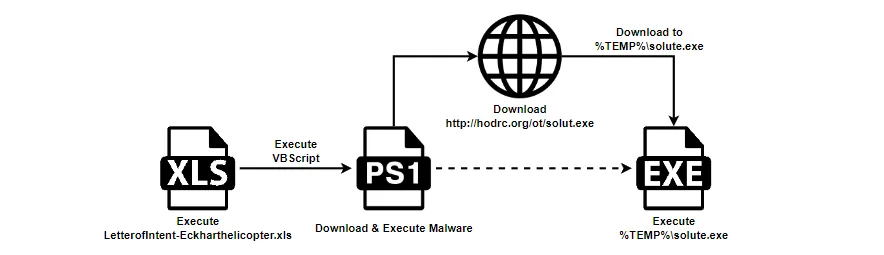 cmd에서 cscript.exe를 이용해서 VBScript 코드를 실행하면 위와 같이 실제 Shell() 함수가 실행하려는 명령어를 볼 수 있다. 명령어는 powershell을 이용해서 http[:]hodrc[.]org/ot/solut.exe를 %TEMP% 경로에 solute.exe로 저장하고 실행하도록 구성되있다.