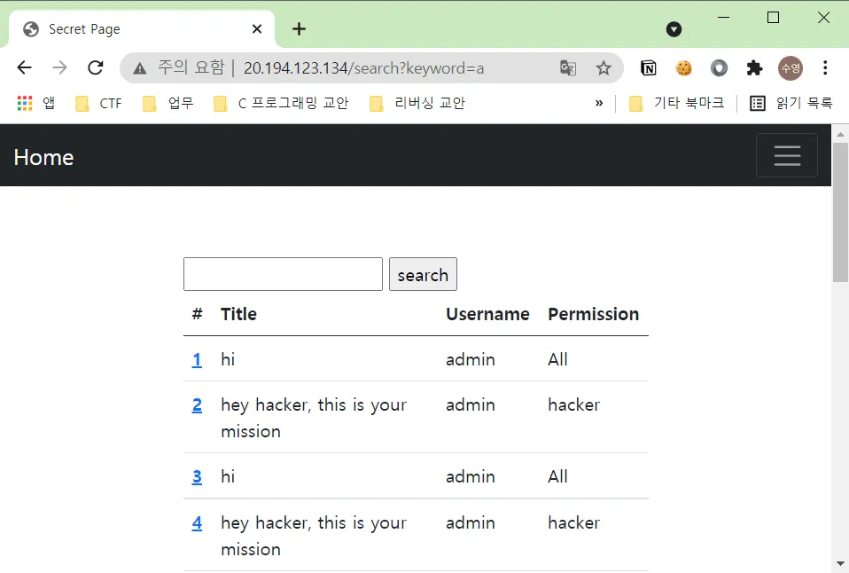 Permission이 All인 게시글을 접속이 가능하지만 hacker인 게시글은 접속이 불가하다.