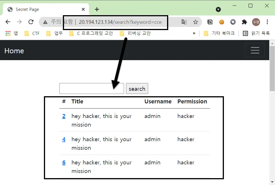 플래그가 cce{.....}로 구성된 것을 유추해볼 때 "ca"를 검색하면 나오지 않지만 "cc"를 검색하면 검색 결과가 나온다. 따라서 검색 결과로 Permission에 "All"이 나오지 않고 "hey hacker"가 나오는 조건의 문자열을 brute forcing했다.