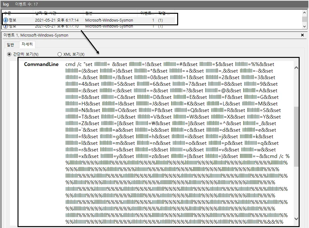 문제 로그파일을 확인해보면 2021-05-21 오후 6:17:14에 cmd를 실행한 흔적을 찾을 수 있다.
