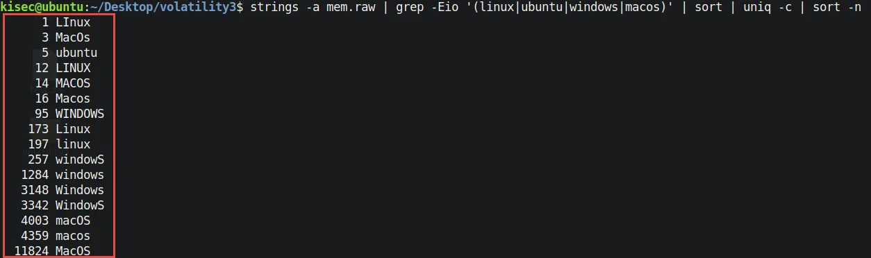 strings -a mem.raw | grep -Eio '(linux|ubuntu|windows|macos)' | sort | uniq -c | sort -n