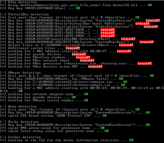 Pafish에서 탐지하는 항목은 크게 아래와 같이 나눌 수 있다.