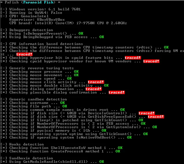 Pafish(Paranoid Fish)는 멀웨어 패밀리와 동일한 방식으로 가상 머신 및 멀웨어 분석 환경을 탐지하기 위해 다양한 기술을 사용하는 테스트 도구이다. 해당 도구는 자유 오픈 소스이며 모든 anti-analysis 기술의 코드는 공개적으로 사용 가능하다.