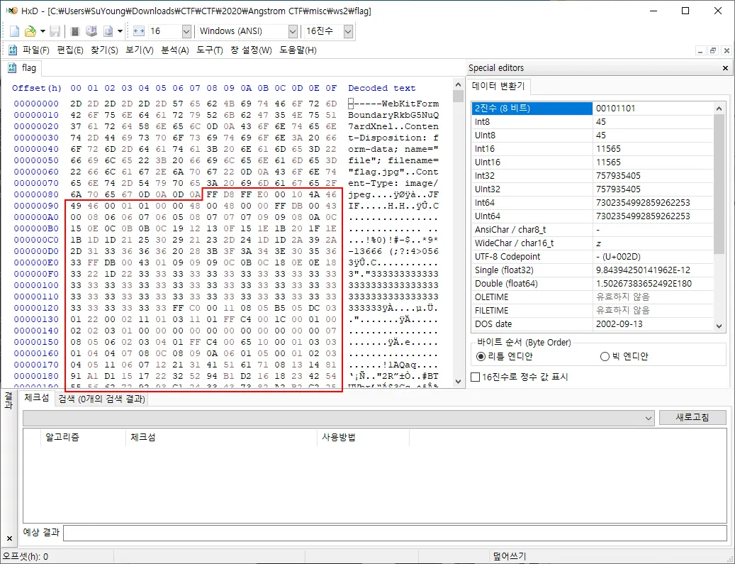 저장한 파일을 HxD로 열어보면 저장한 54번째 패킷을 확인할 수 있고 이 중에서 실제 jpg 파일을 추출한다. jpg파일은 위의 그림과 같이 FF D8 FF E0 라는 파일 시그니처를 갖고있고 빨간 부분을 제외한 윗 부분을 제거하고 다시 저장하면 플래그가 나온다.